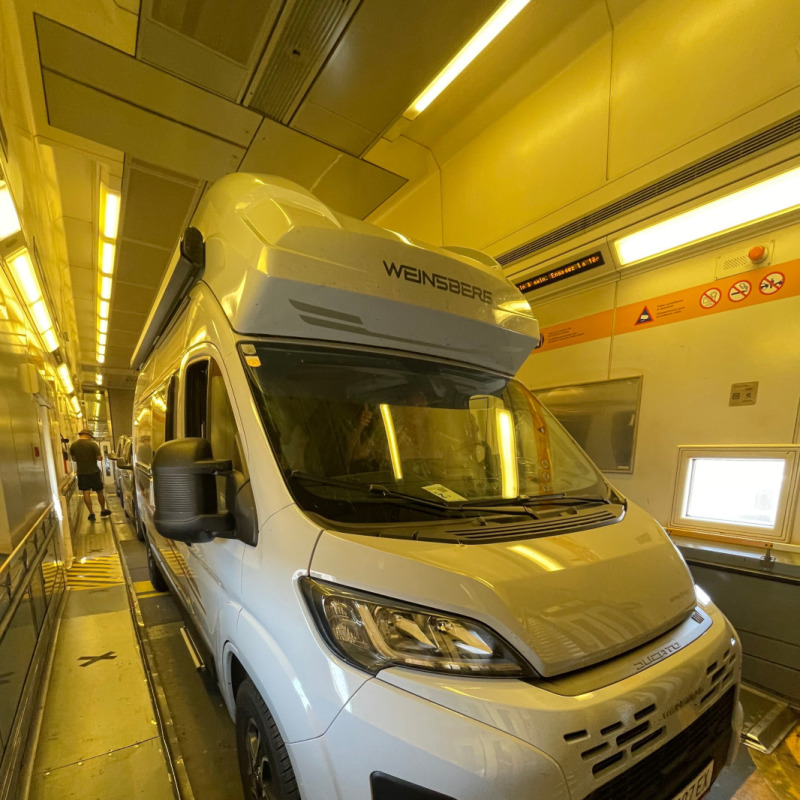 Dort checken wir für die Fahrt durch den Eurotunnel gegen Mittag ein.